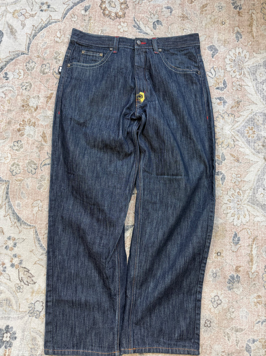 Vintage Y2K Risk Jeans Embroidered Back Pockets Regular Fit Dark Blue Denim Size 37W