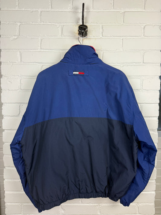 Vintage 90s Tommy Hilfiger Fleece Lined Two Tone Sleeve Spell Out Nylon Bomber Size L