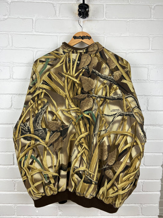 Vintage 90s Herters Advantage Wetlands Camo Quilted Lined Insulated Button Up Bomber Jacket Size XXL