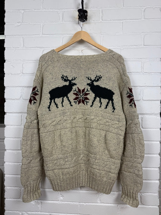 Vintage 90s Polo Ralph Lauren Reindeer Snowflake Wool Hand Knit Cable Sweater Size XL