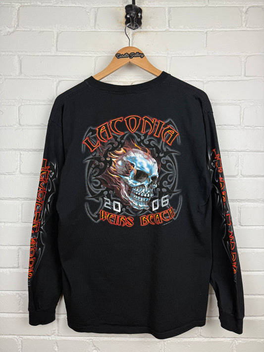 Vintage 2006 Laconia Weirs Beach Flames Skull Tribal Long Sleeve T Shirt Size L