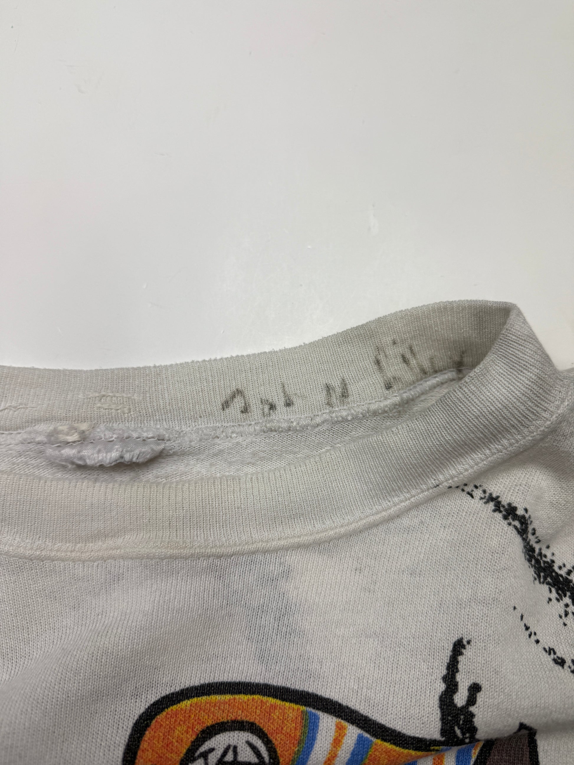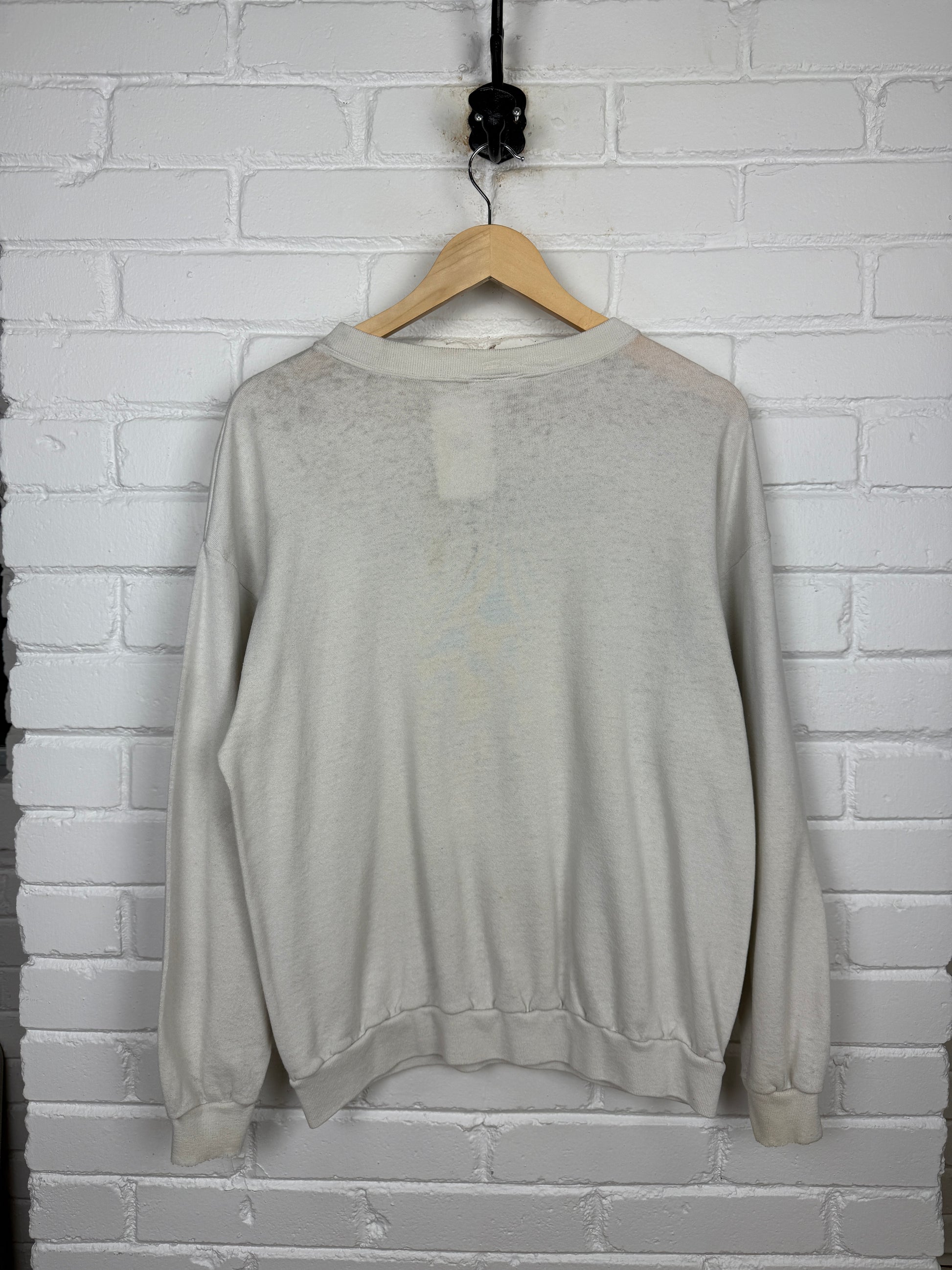 General wear found around due to age. Sweatshirt material is thin due to age. Marks on collar. Pinhole on left lseeve. Fraying and distressing on sleeve cuffs. Light marks on back.