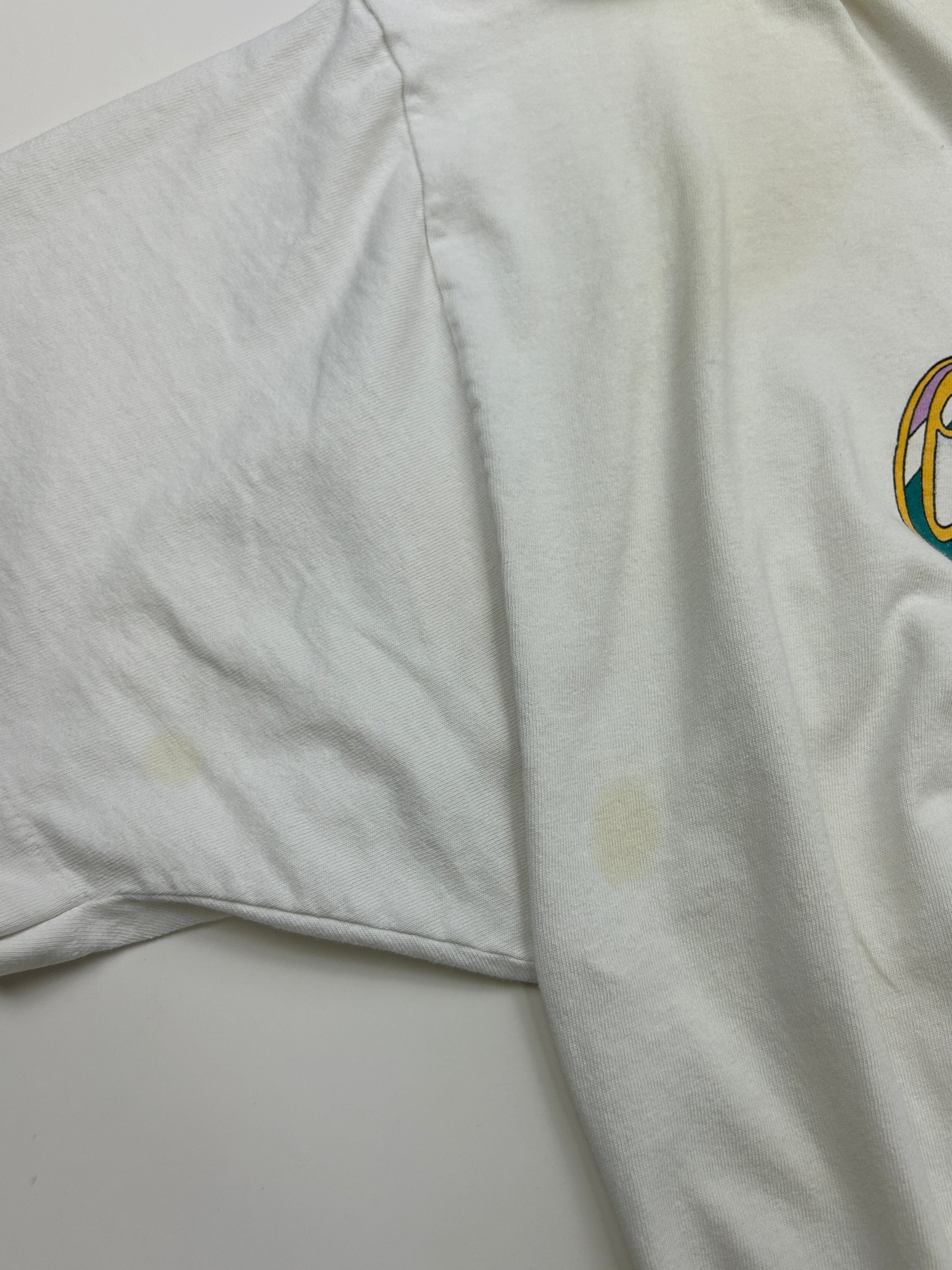 General wear found around due to age. Distressing and fraying on collar. Minor yellowing near collar. Light marks on front by print. Pinhole under right armpit.