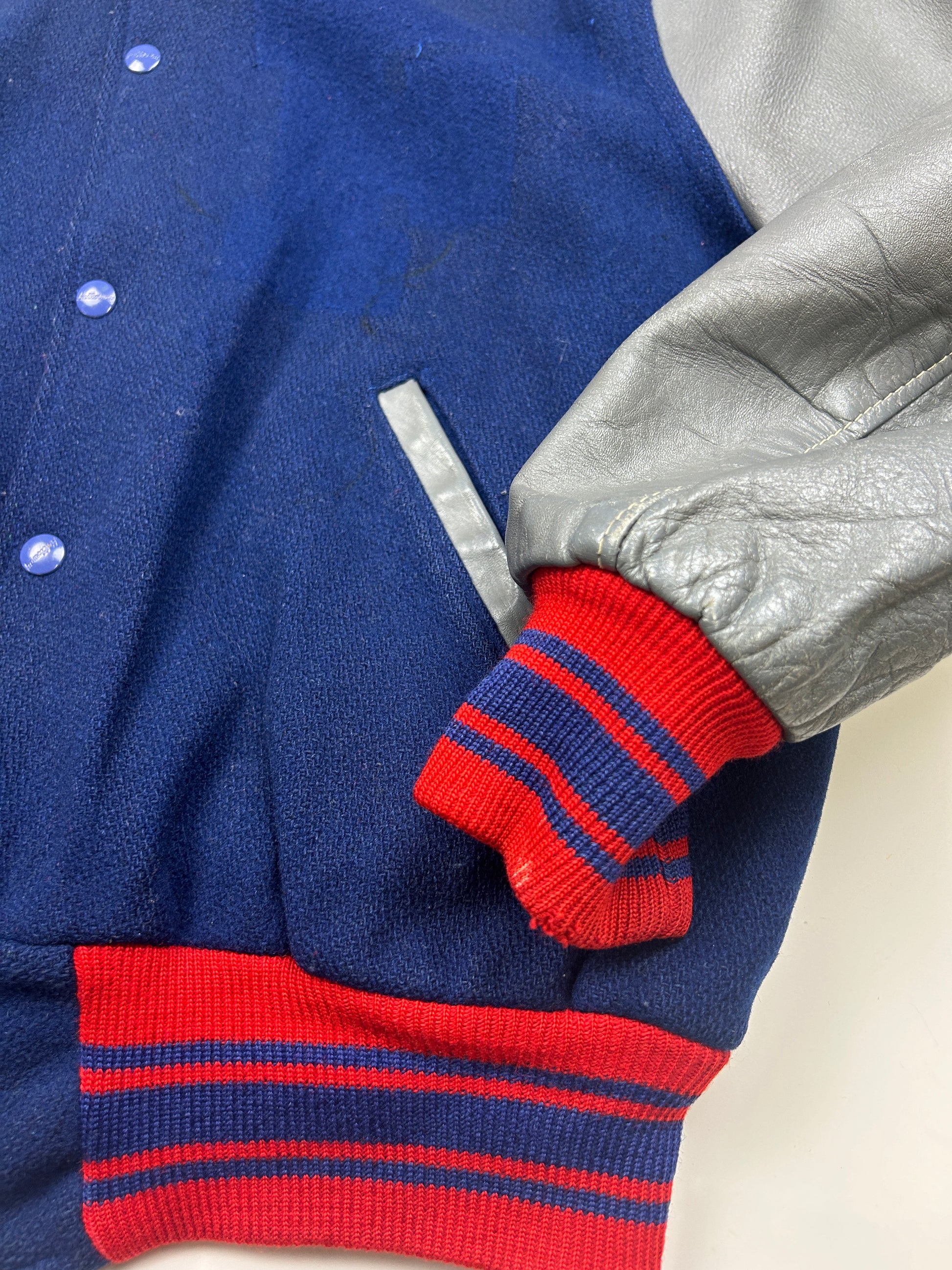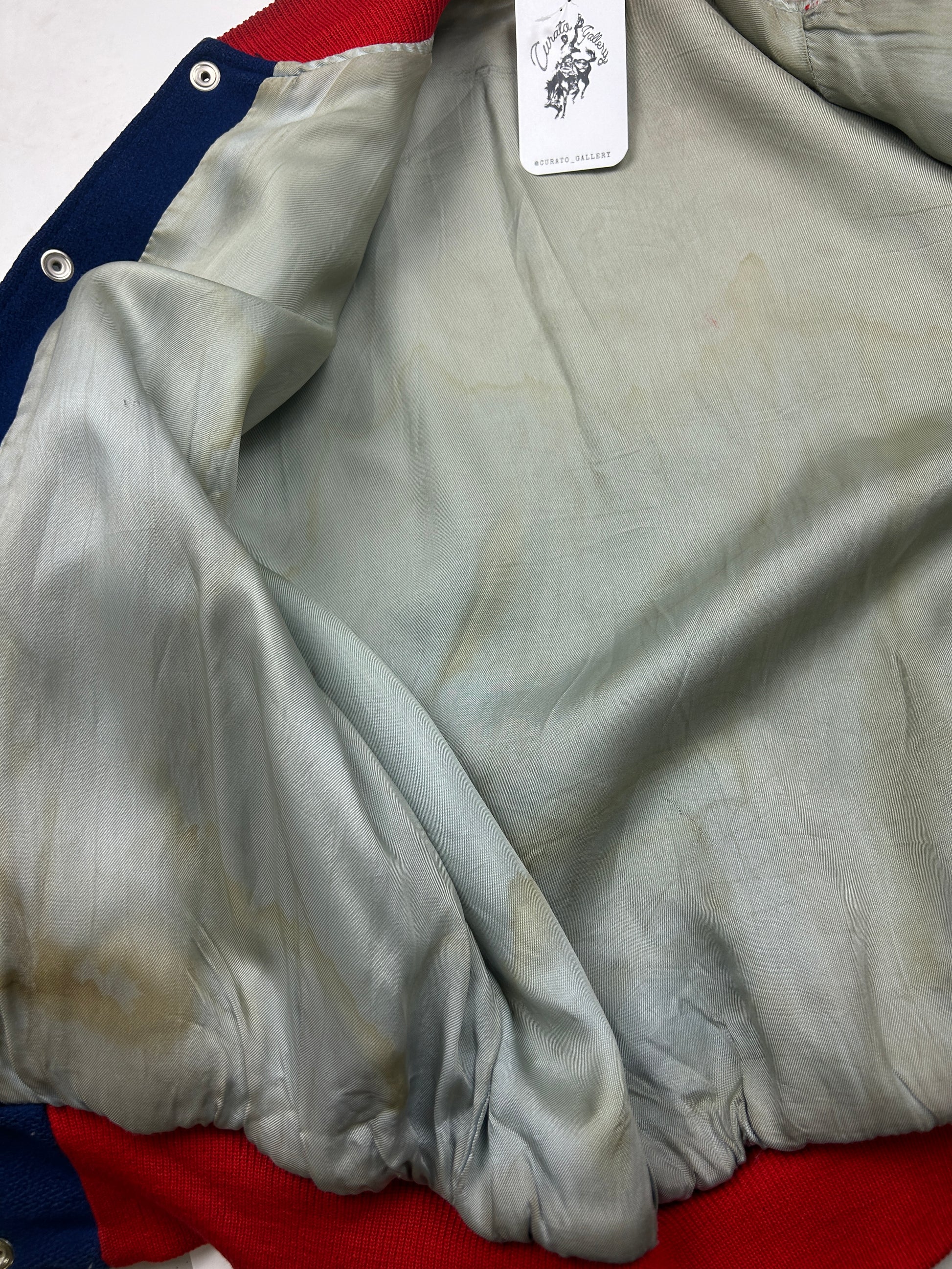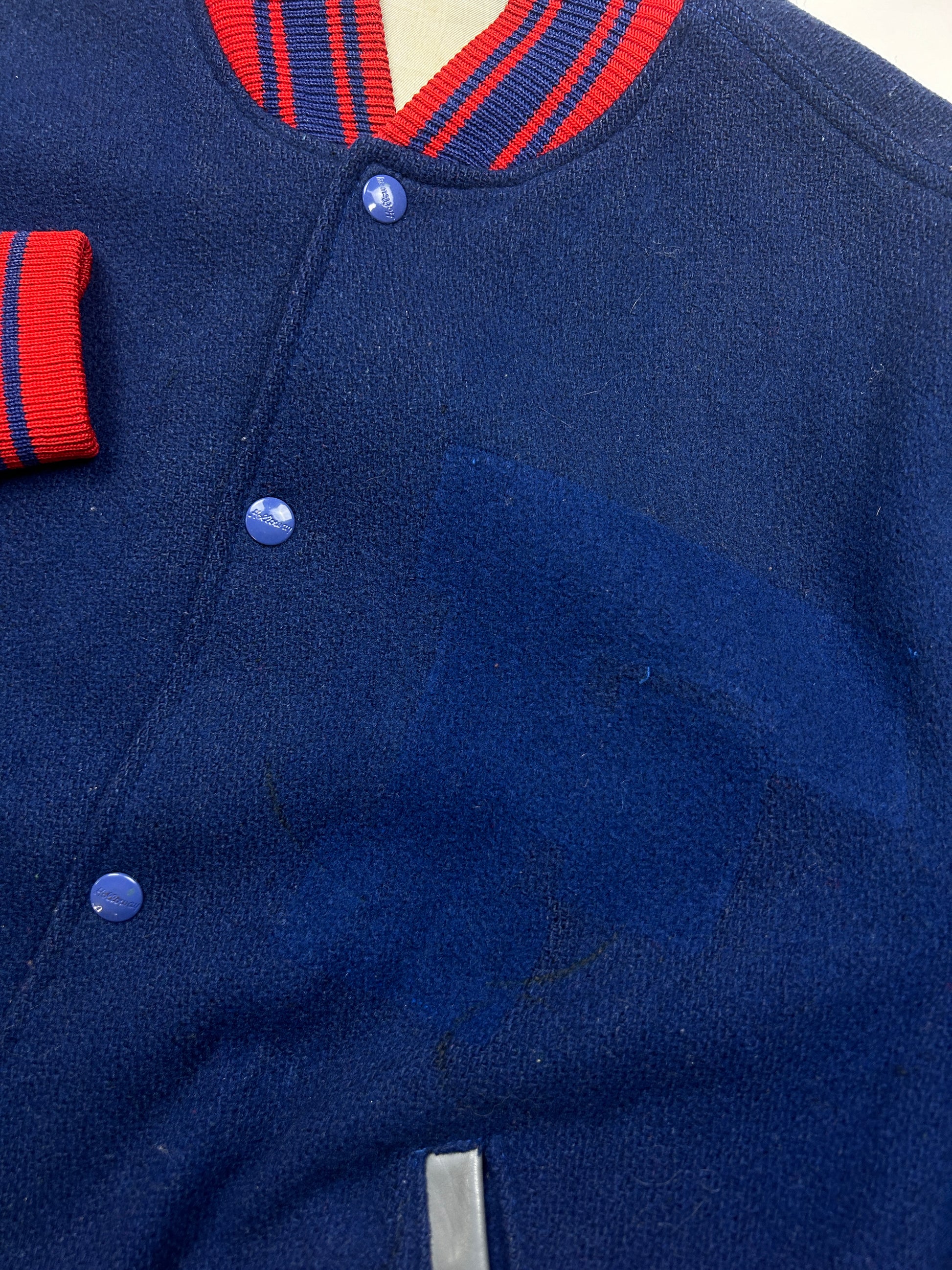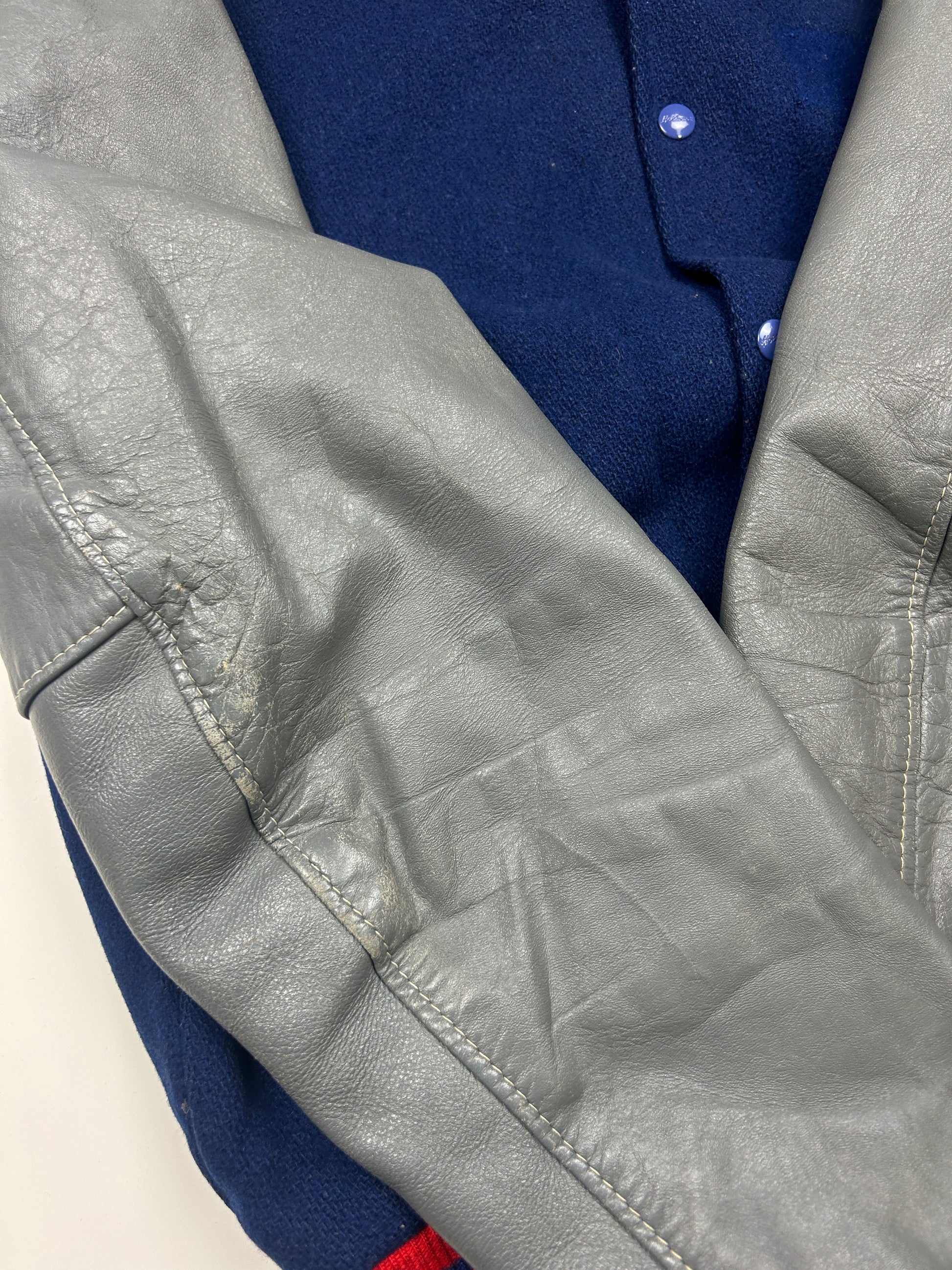 General wear found around due to age. Patch on front has been removed. Marks on inner lining. Minor cracking on sleeves.