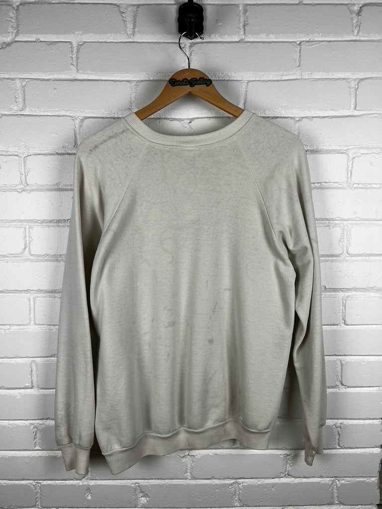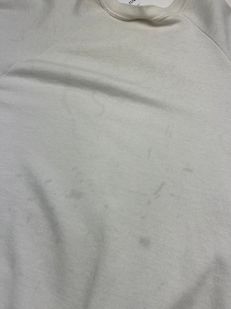 General wear found around due to age.Sweatshirt material is thin due to age. Marks on front and back.