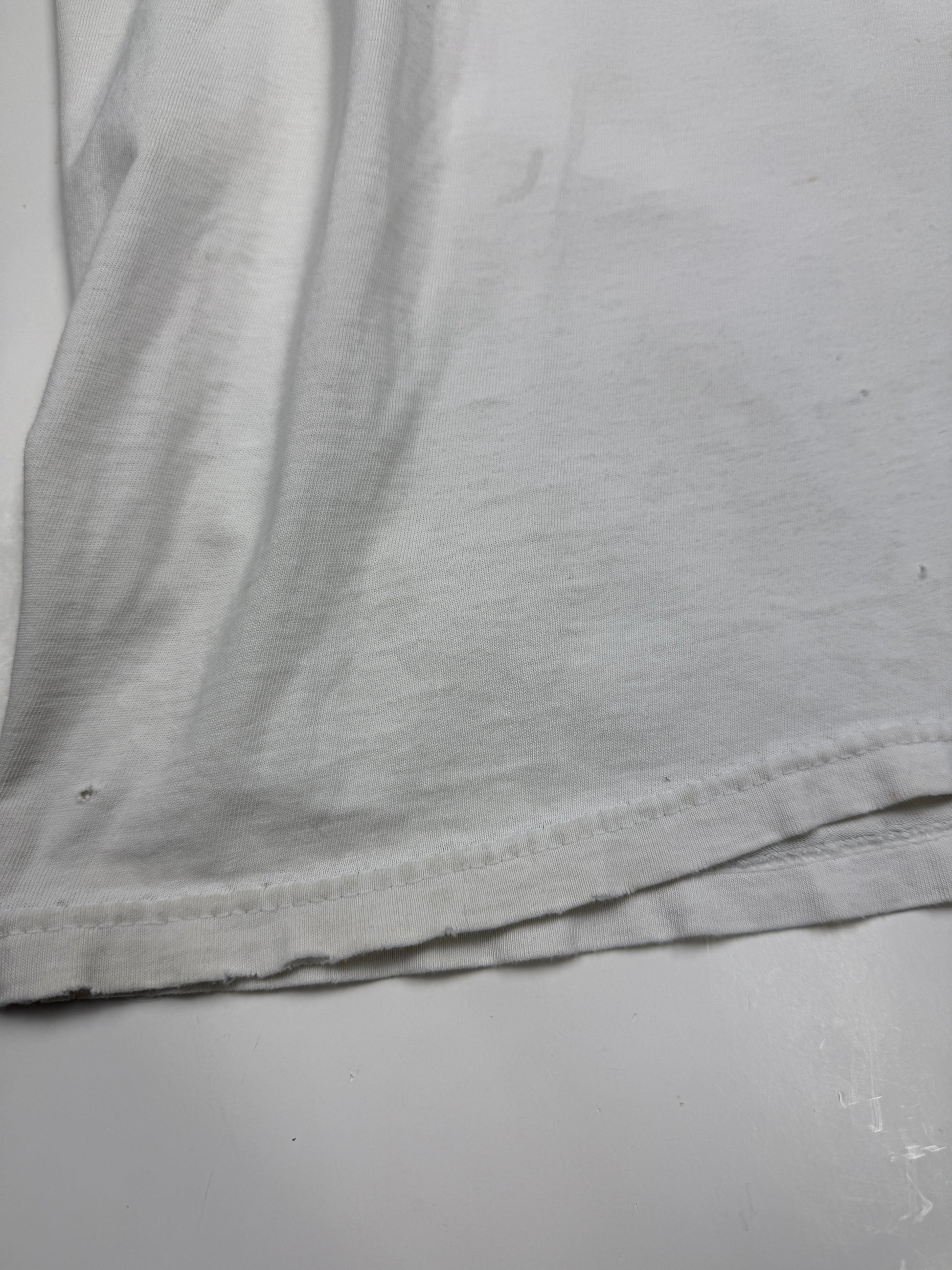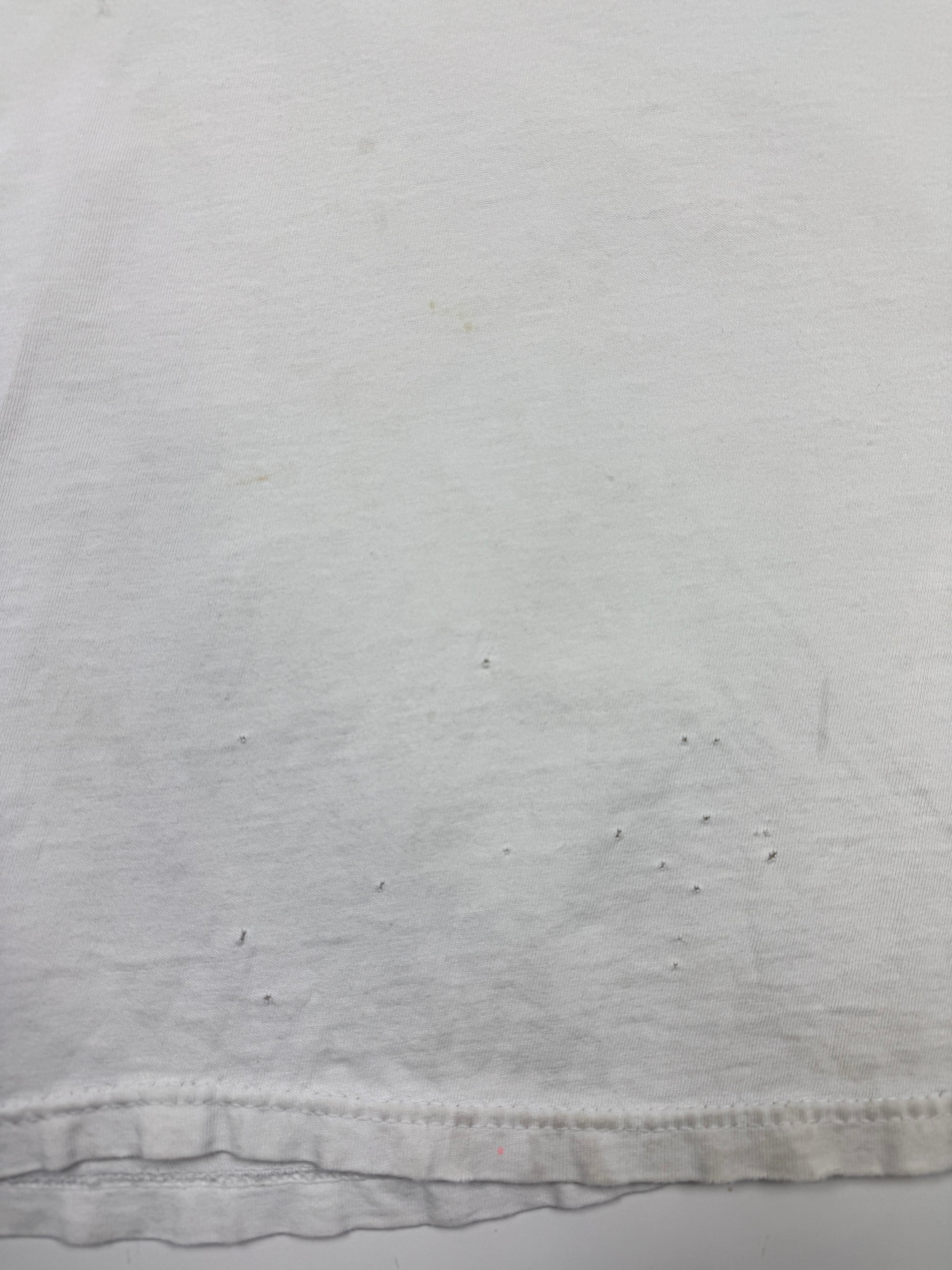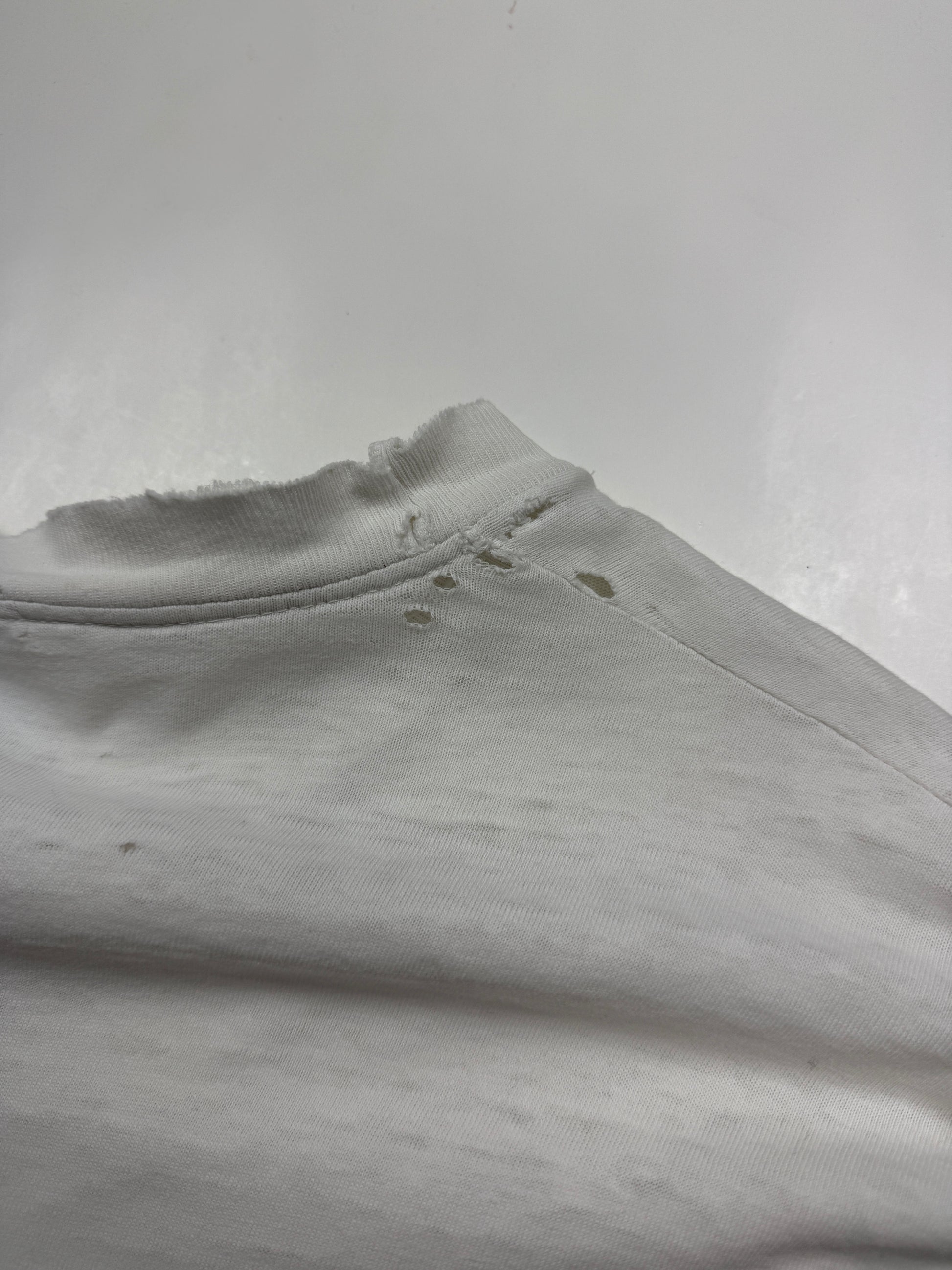 General wear found around due to age. T Shirt material is thin. Fading on print. Fraying and distressing on collar and cuffs and on bottom ribbing. Pinholes on back near collar, under left armpit and on front by bottom. Light marks on front by bottom.
