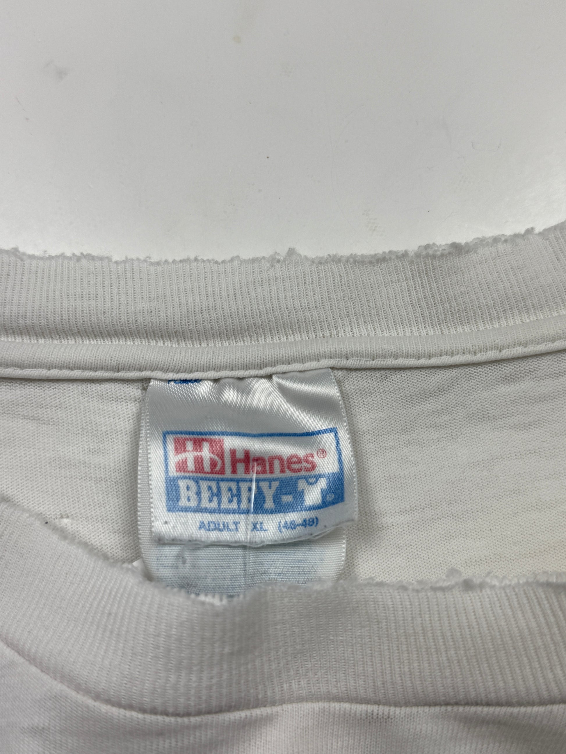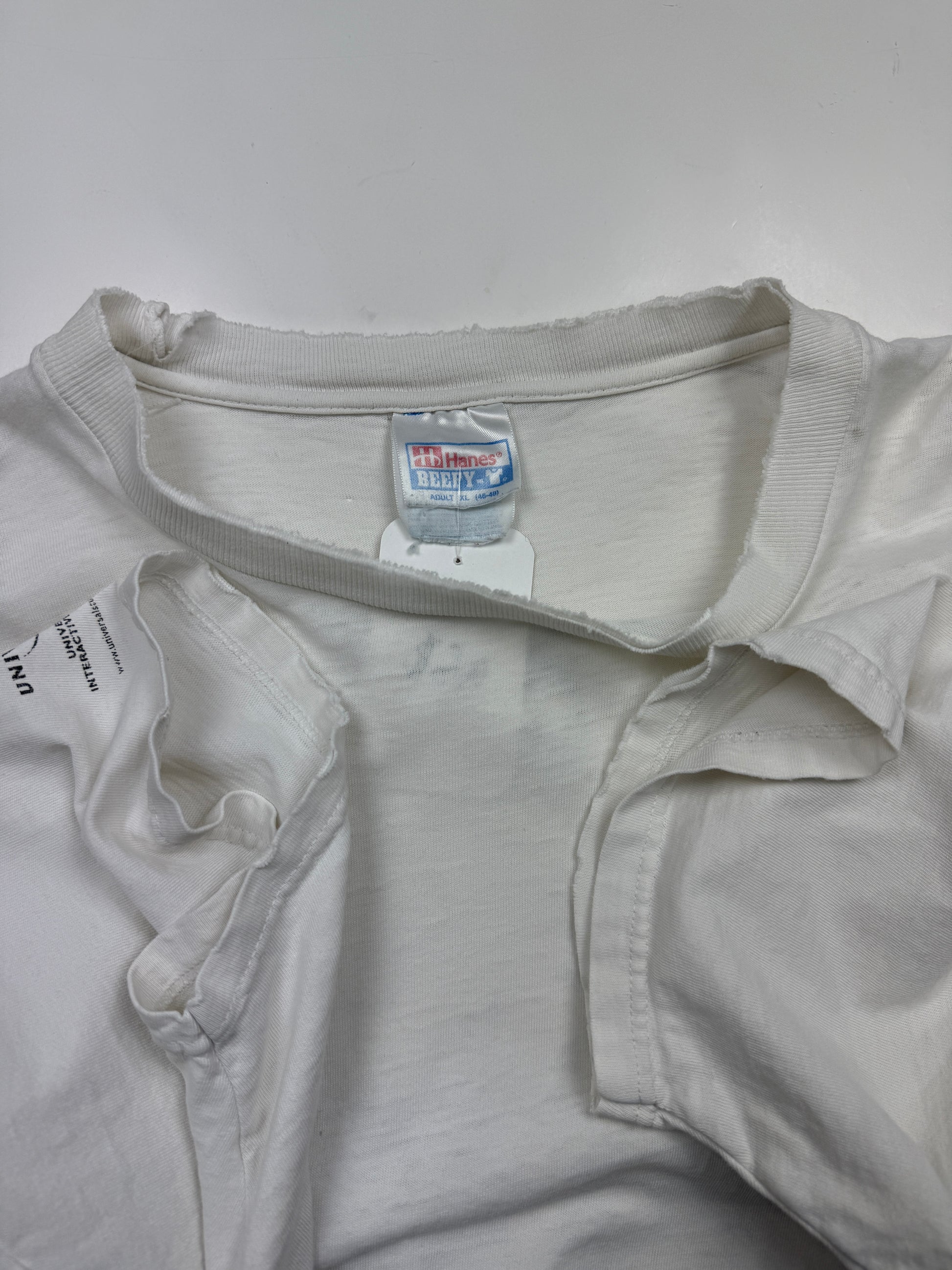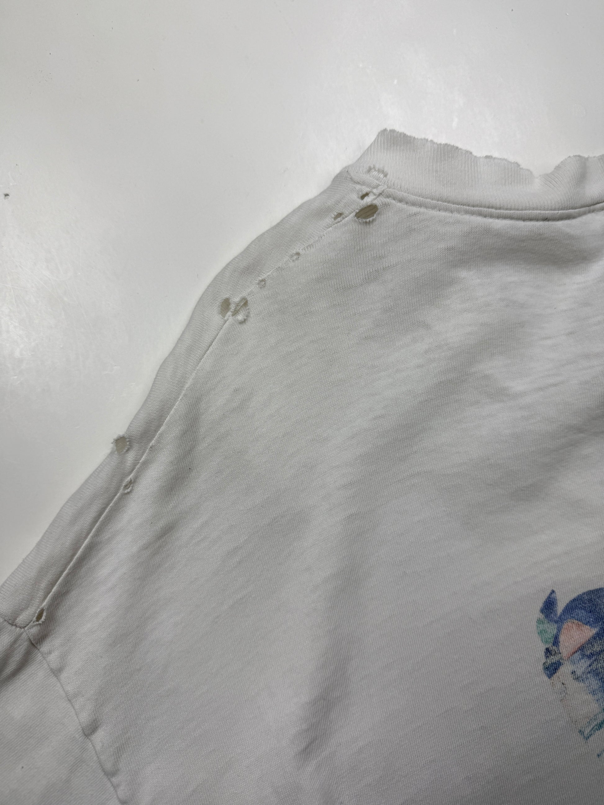 General wear found around due to age. T Shirt material is thin. Fading on print. Fraying and distressing on collar and cuffs and on bottom ribbing. Pinholes on back near collar, under left armpit and on front by bottom. Light marks on front by bottom.